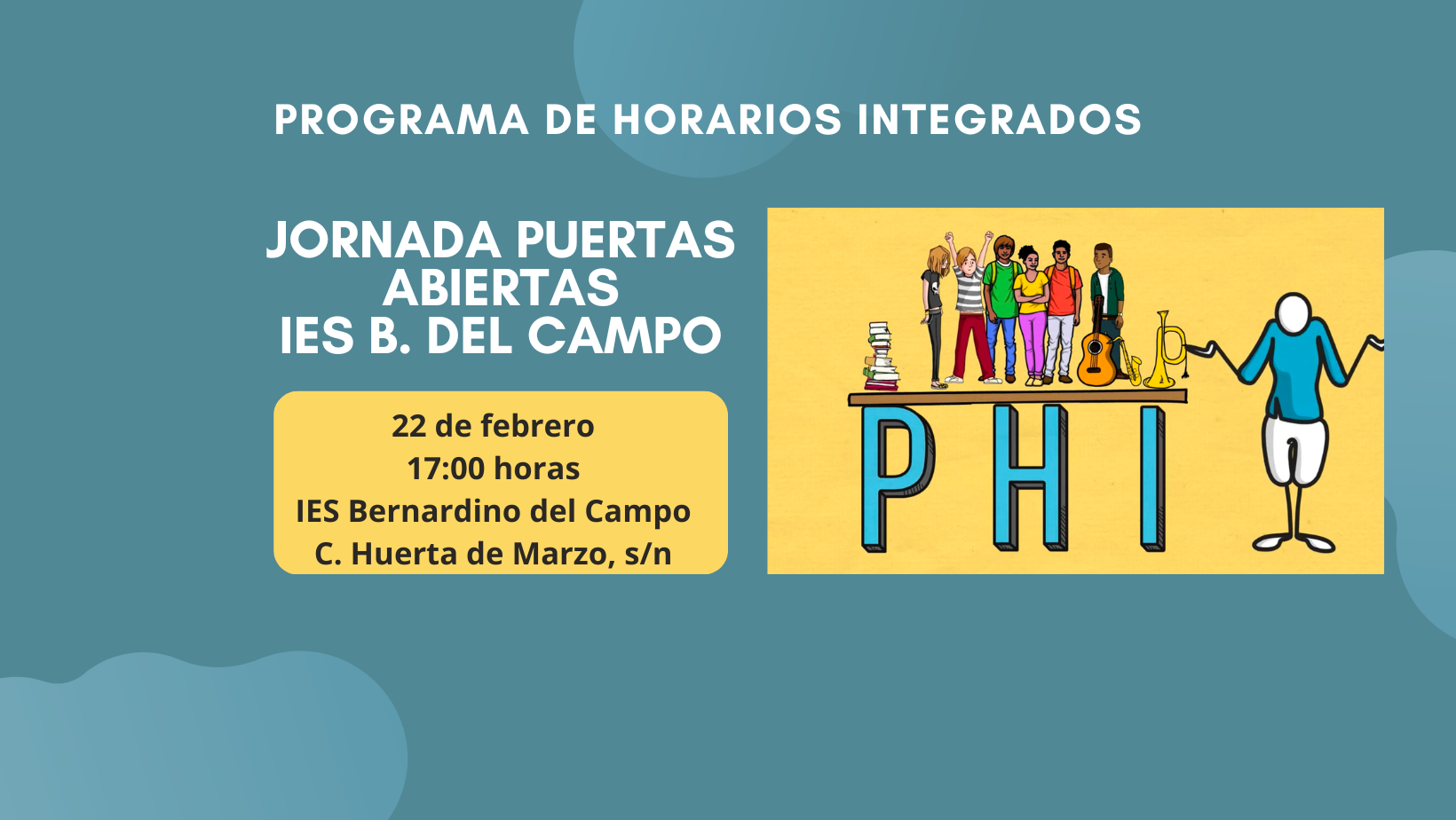 DetailsJORNADA PUERTAS ABIERTAS: PROGRAMA DE HORARIOS INTEGRADOS IES BERNARDINO DEL CAMPO (c/ Huerta de Marzo, s/n) 22 de febrero, 17:00 horas El Programa de Horarios Integrados facilita, que nuestro alumnado,…