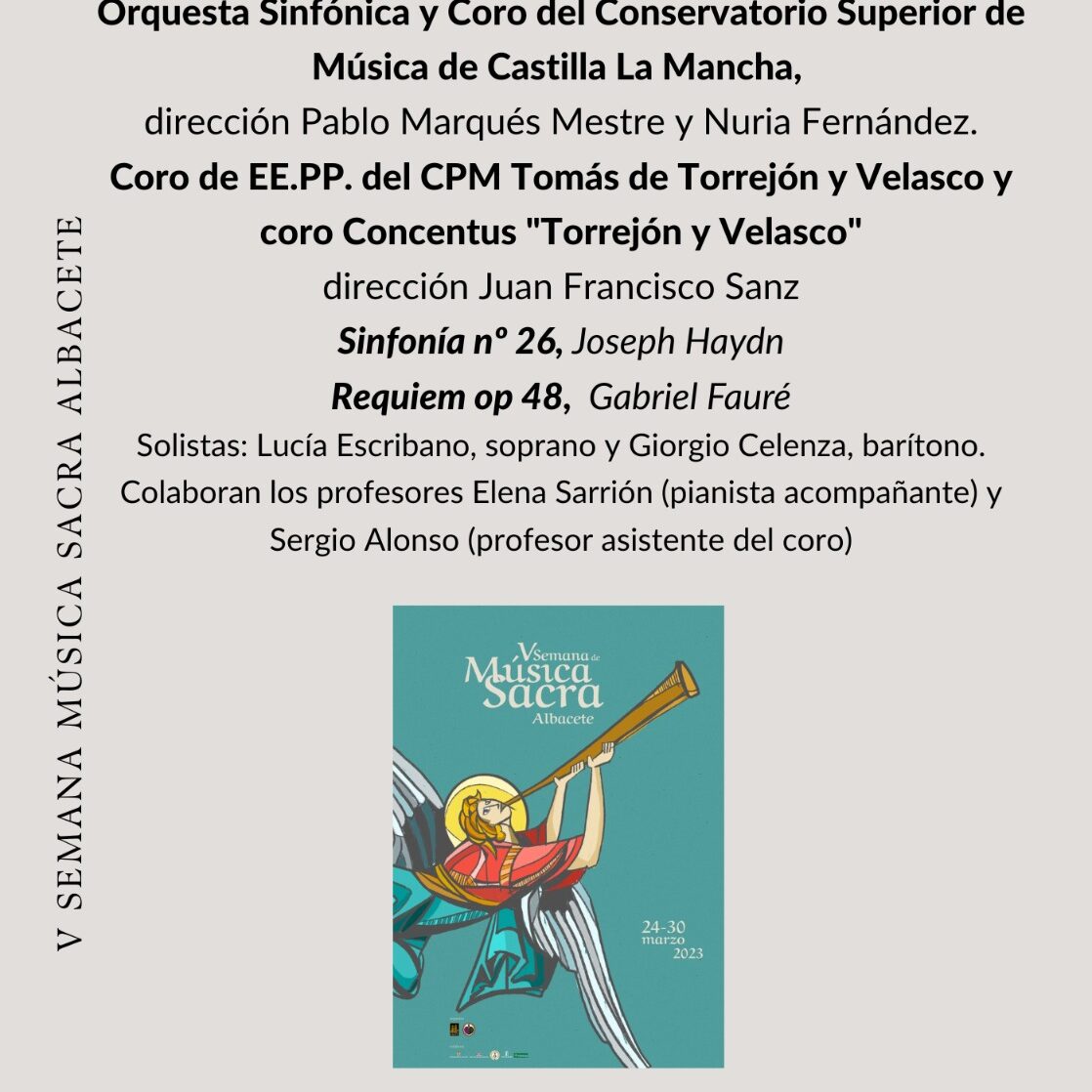 Esta tarde del miércoles día 29 de marzo a las 21:00 horas en la Catedral de Albacete y con entrada libre, el coro de 5° y 6° curso de Enseñanzas Profesionales del CPM Tomás de Torrejón y Velasco, junto al coro Concentus Torrejón y Velasco y los alumnos de coro del Conservatorio Superior de Música de Castilla-La Mancha interpretarán, bajo la dirección de Pablo Marqués Mestre, el Réquiem Op.48 de Gabriel Fauré.